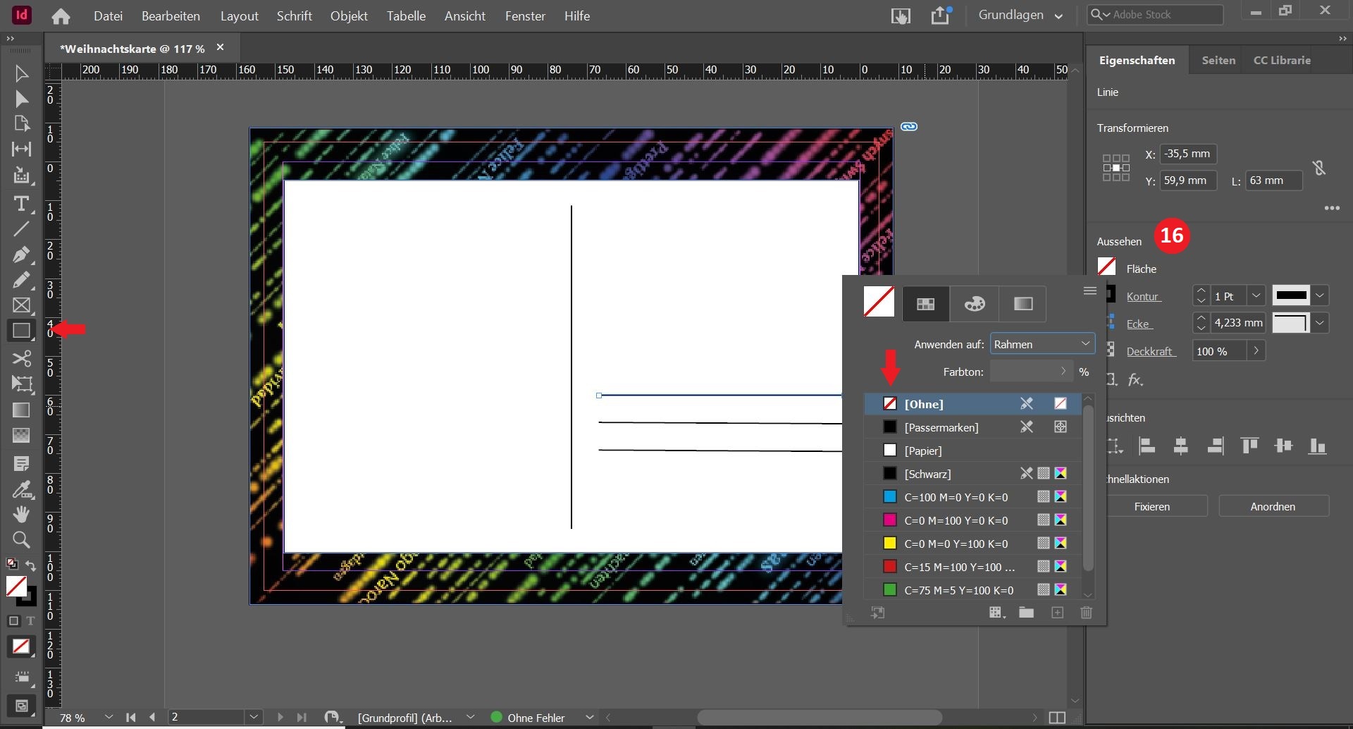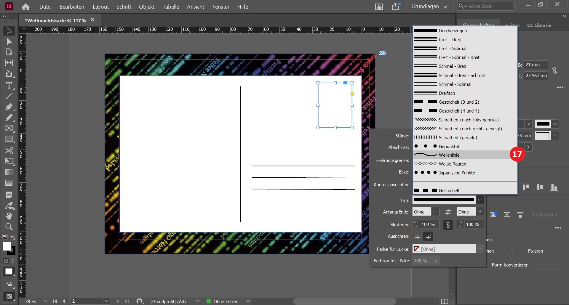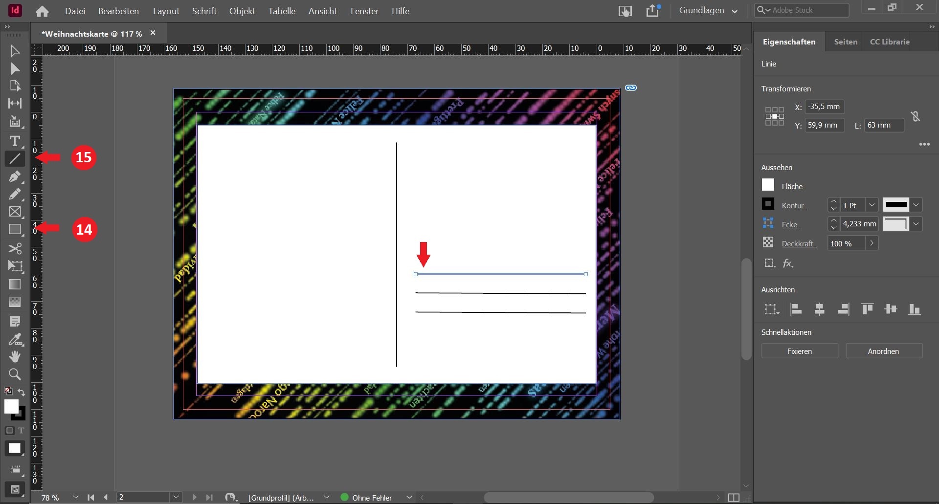 15. Wechseln Sie in der linken Werkzeugleiste zum Linien-Werkzeug und ziehen Sie eine Mittellinie sowie ein paar weitere Linien für die Anschrift des Weihnachtkarten-Empfängers.