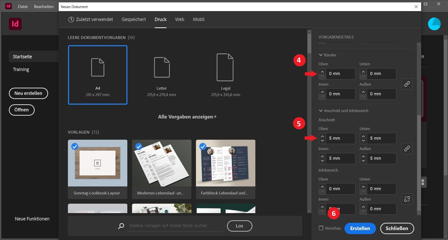 5. Öffnen Sie den Bereich Anschnitt und Infobereich. Geben Sie in einem der Felder unter Anschnitt einen Wert von 5 mm. Die weiteren Felder werden automatisch ergänzt.