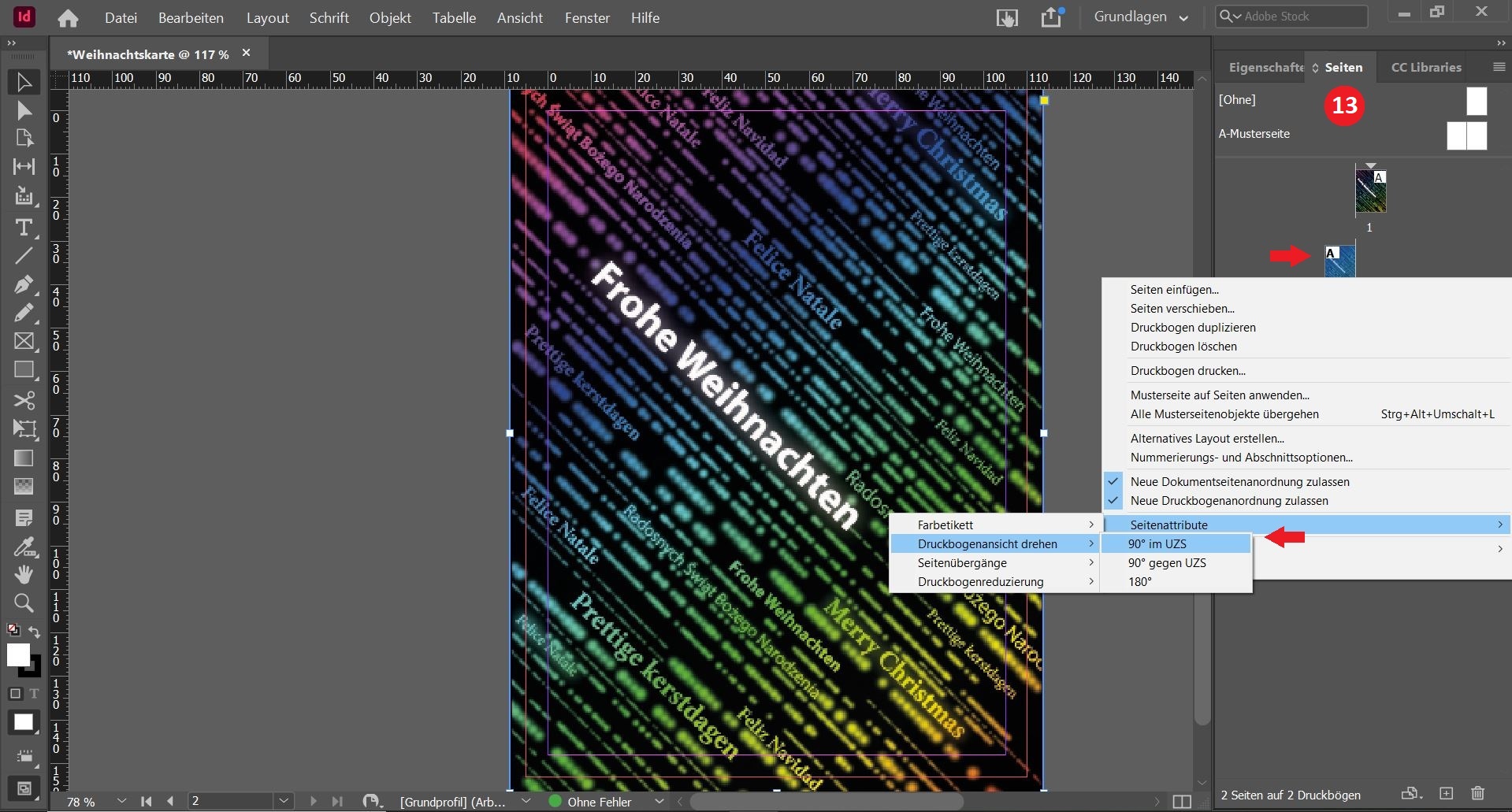 13. Klicken Sie im Bedienfeld Seiten mit der rechten Maustaste auf Seite 2. Drehen Sie nun die Druckbogenansicht um 90 Grad unter Seitenattribute / Druckbogenansicht drehen / 90° im UZS.