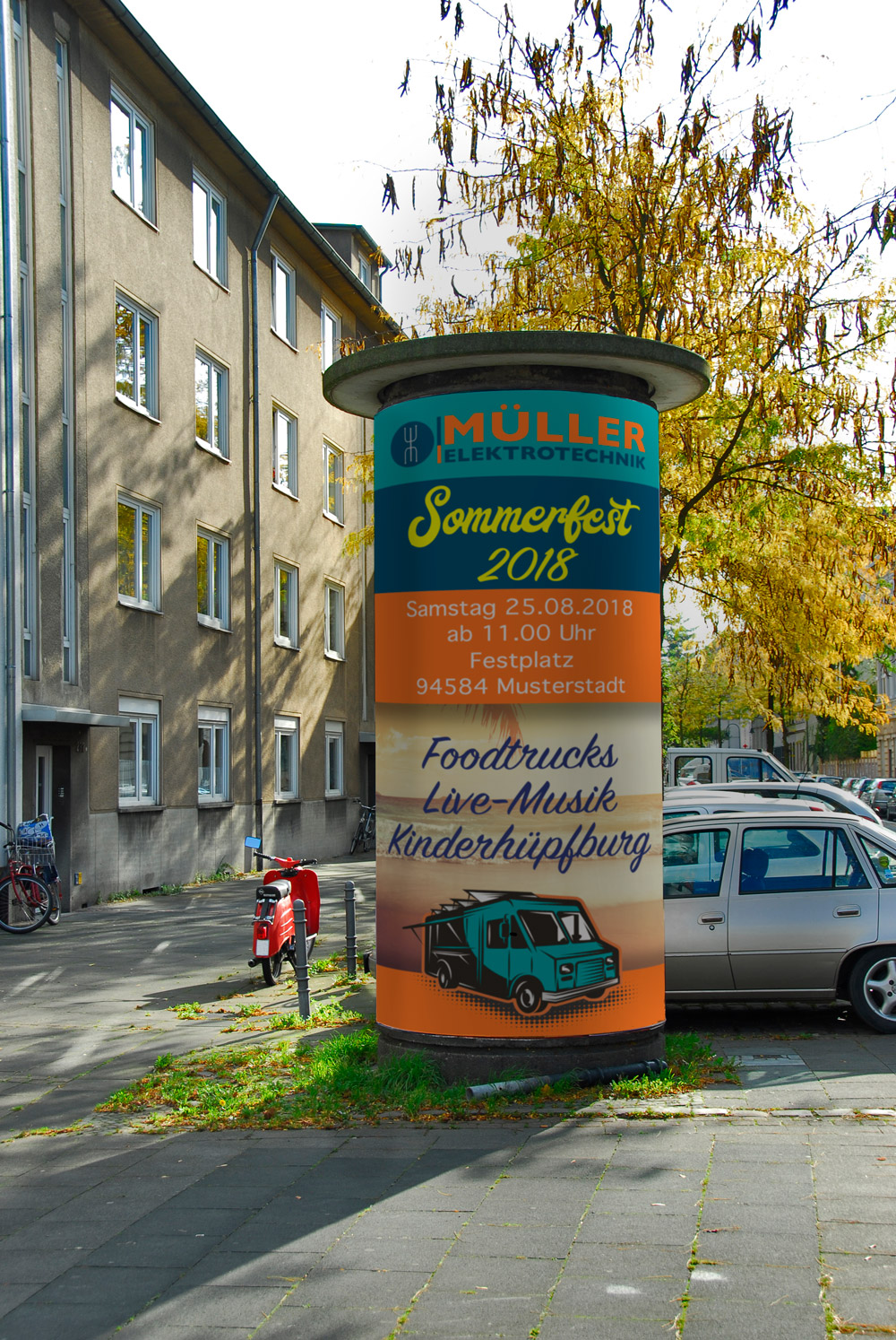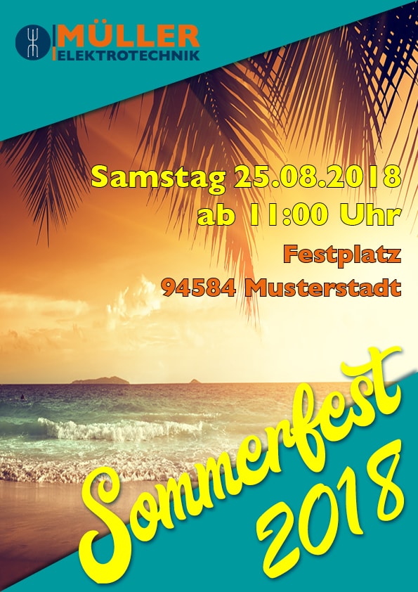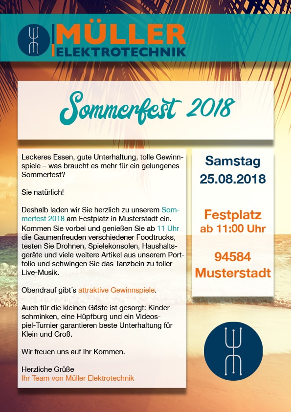Im Beispiel des Sommerfestes von Müller Elektrotechnik sind das die Farben Dunkelblau und Orange, da dies die Firmenfarben des fiktiven Unternehmens sind, kombiniert mit einem sommerlichen Gelb, Orange und Türkis. Auch das Firmenlogo, der Schriftzug Sommerfest 2018 und das Strandmotiv sind Inhalt jeder Werbemassnahme, ob Plakat, Litfasssäule, Postwurfsendung, Printanzeige oder Social Media Post.