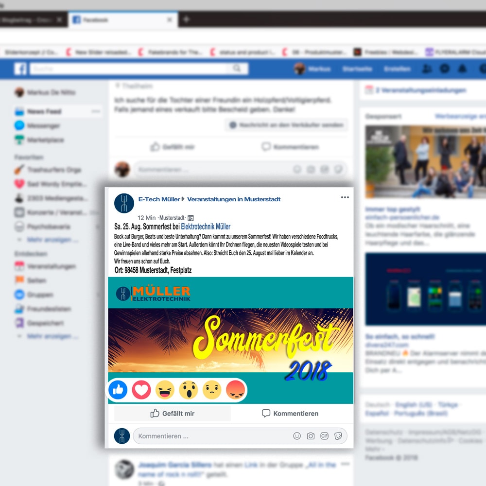 Als Fallbeispiel wird im Folgenden eine crossmediale Werbekampagne für das Sommerfest der fiktiven Firma Müller Elektrotechnik geplant. Ob Sie ein Jubiläum, ein Grillfest oder die Eröffnung einer Filiale vermarkten möchten, ob Sie für einen Handwerksbetrieb, einen Einzelhändler oder einen Sportverein tätig sind: Lassen Sie sich inspirieren und übertagen Sie die Ideen des fiktiven Beispiels auf Ihre eigene Kampagne.