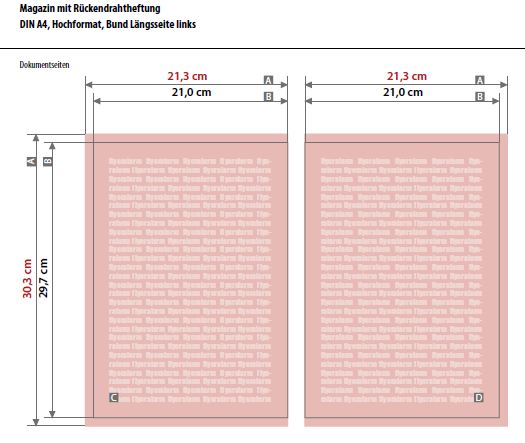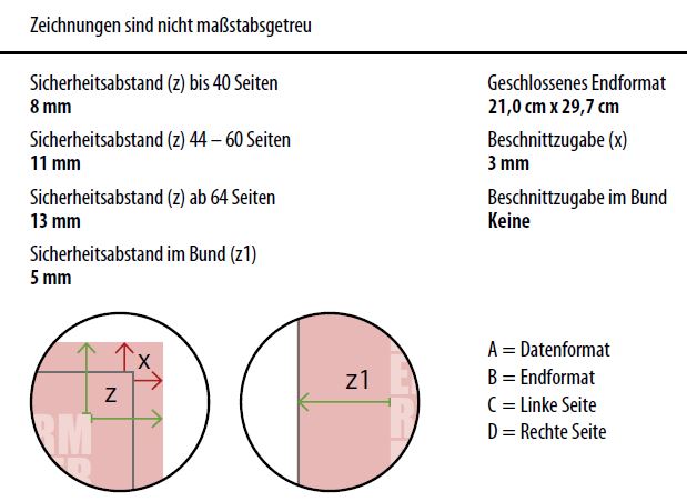 Zudem finden Sie hier die Informationen über Sicherheitsabstände für grafische und textliche Inhalte zum Rand. In diesem Fall beträgt der Sicherheitsabstand 8 mm je Seite, da das Magazin weniger als 40 Seiten haben soll.