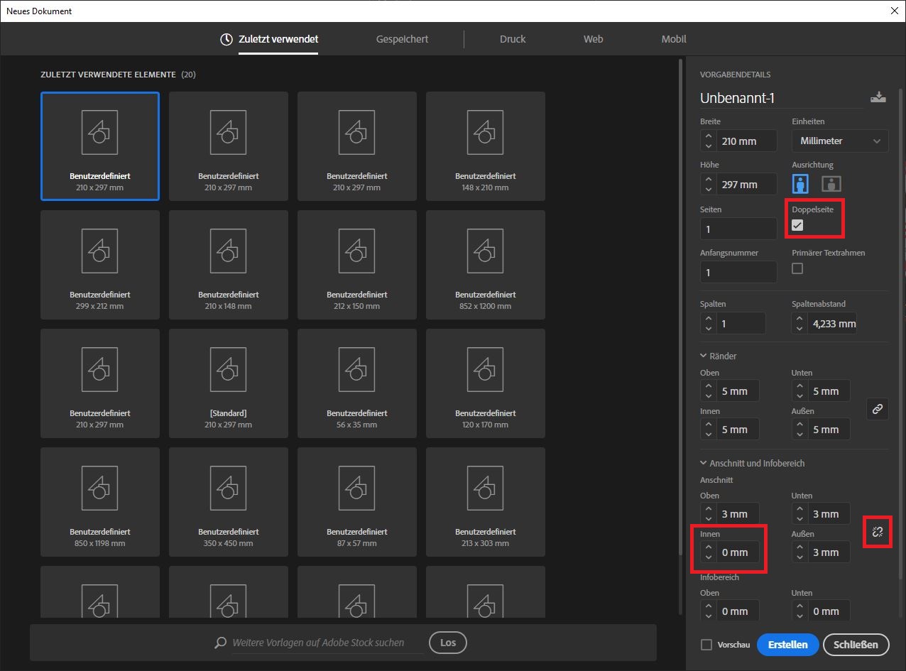Gleiches gilt für die Beschnittzugabe: Diese legen Sie beim Anschnitt fest. In diesem Beispiel tragen Sie 3 mm Beschnittzugabe für Oben, Unten und Aussen ein. Ein Klick auf den Button mit dem Kettensymbol ermöglicht es Ihnen wieder, die Beschnittzugabe für Innen separat anzupassen. Im Falle eines Magazins mit Rückendrahtheftung ist hier keine Beschnittzugabe nötig, dementsprechend setzen Sie sie hier auf 0 mm. Klicken Sie anschliessend auf Erstellen.
