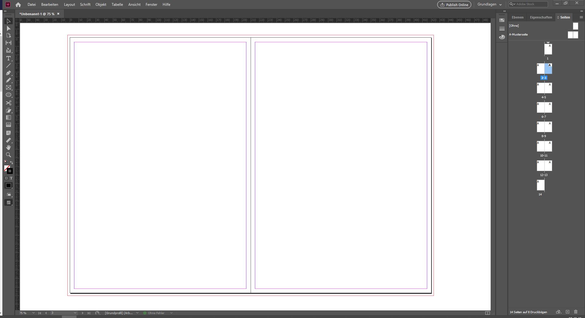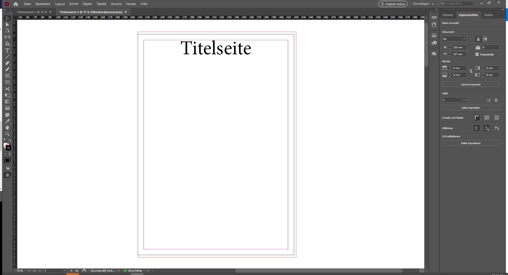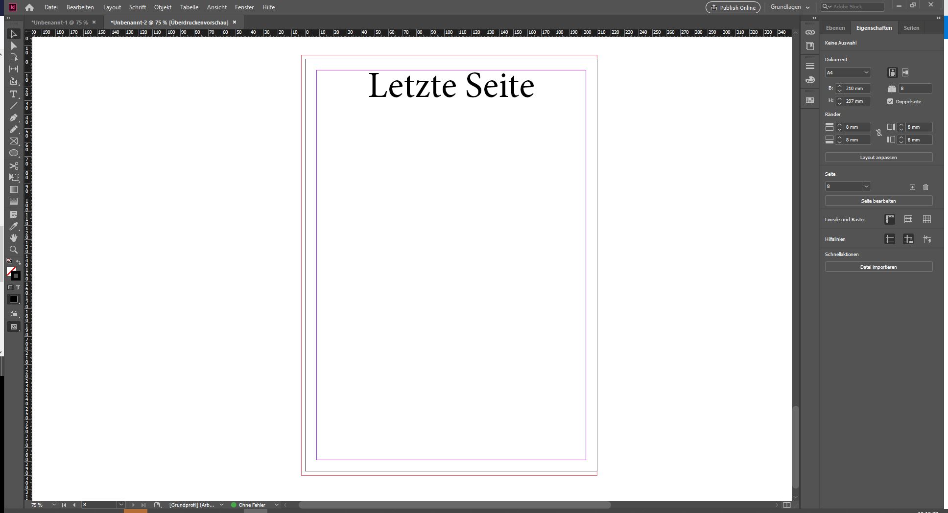 Ein Blick auf die Titelseite zeigt: Auch hier ist die Beschnittzugabe auf der Innenseite nicht enthalten, sondern nur oben, unten und links. Die letzte Seite des Dokuments komplettiert den späteren Druckbogen, der aus Titelseite und letzter Seite bestehen wird. Deshalb ist hier die Beschnittzugabe oben, unten und rechts zu sehen.