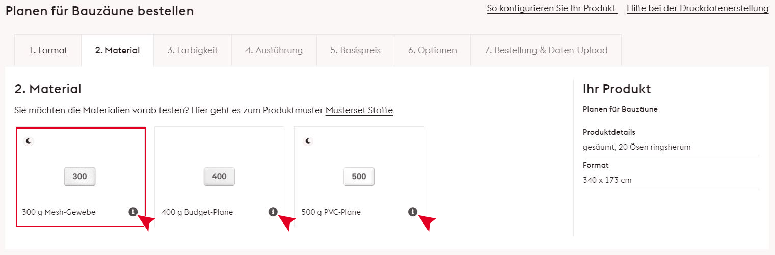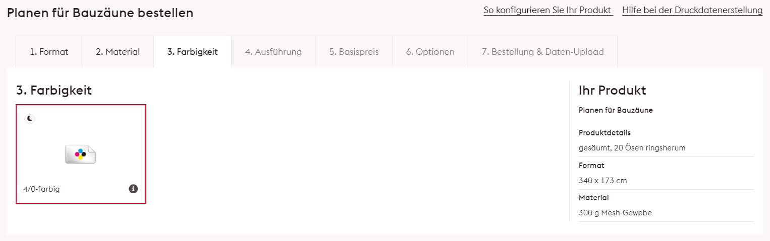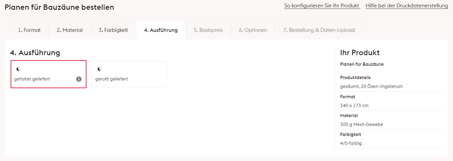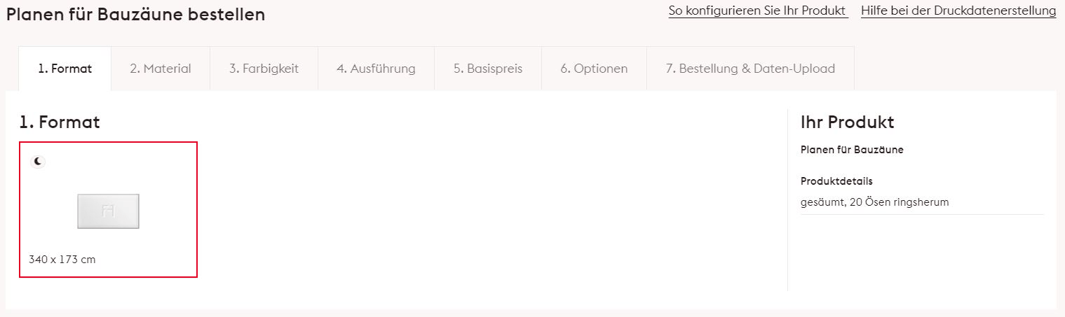 - Öffnen Sie den Onlineshop unter flyeralarm.com und navigieren Sie zum Produkt Planen für Bauzäune. Im Fussbereich der Produktseite finden Sie den Produktkonfigurator. Hier passen Sie Ihre Bauzaunplanen an Ihre Anforderungen an. Wählen Sie zuerst das Format aus.