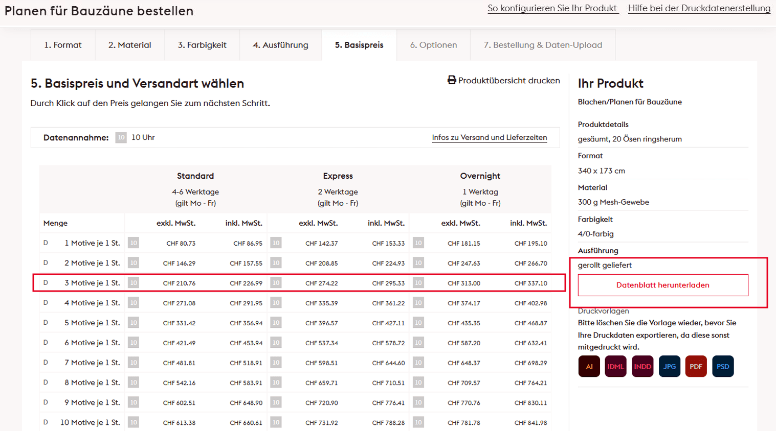 - Wählen Sie im Schritt Basispreis des Produktkonfigurators z. B. 3 Motive je 1 St. in der gewünschten Versandart aus. Dafür klicken Sie auf den entsprechenden Bereich innerhalb der Preistabelle. Laden Sie sich rechts das Datenblatt herunter und nutzen Sie auch gerne die kostenlosen Druckvorlagen als Hilfestellung.