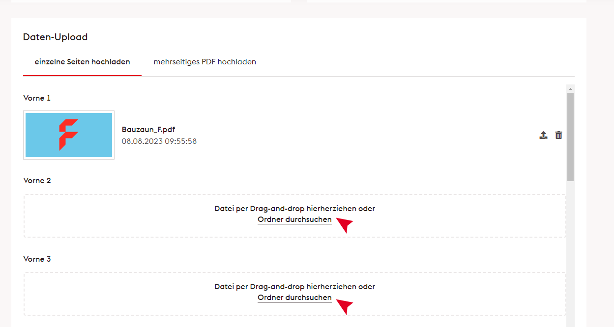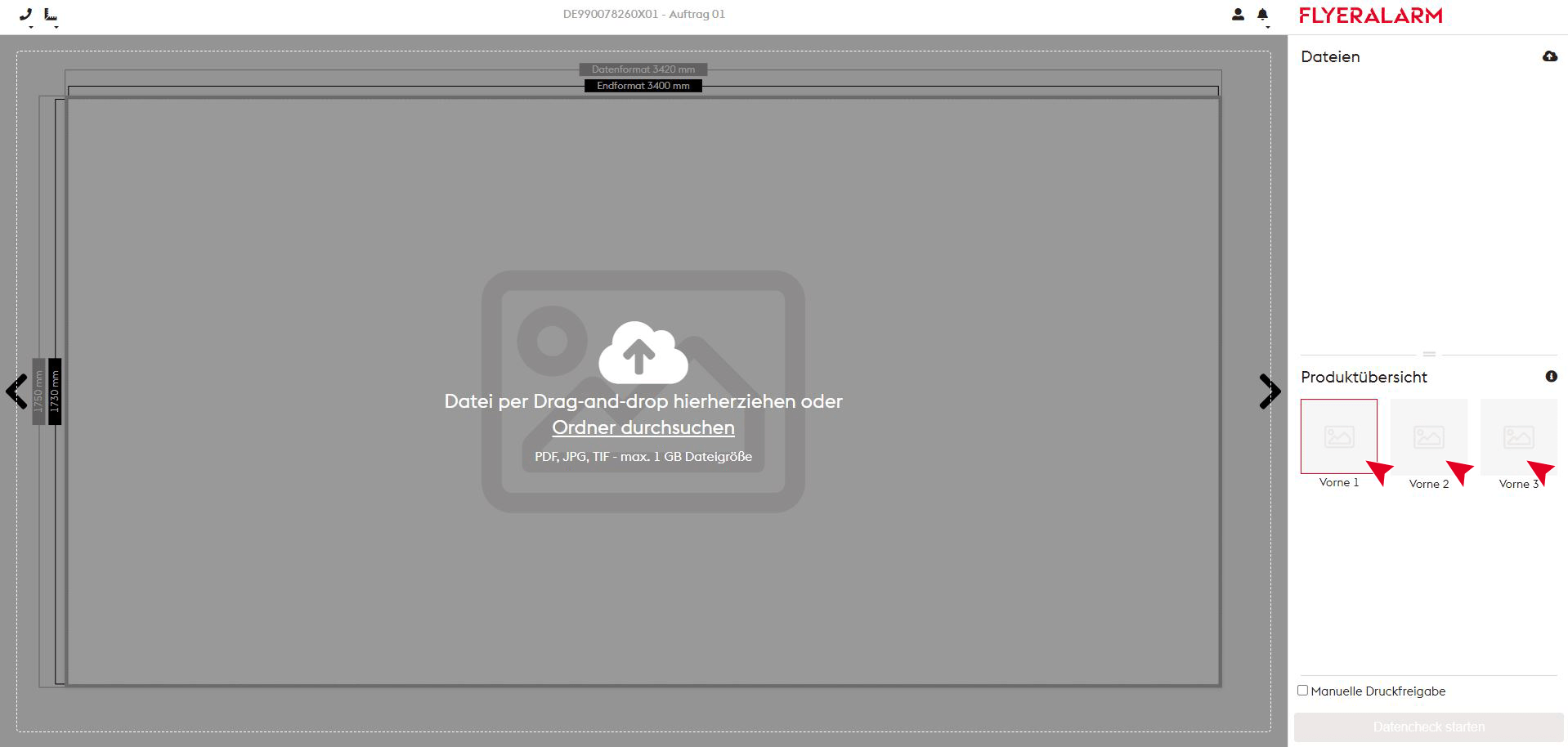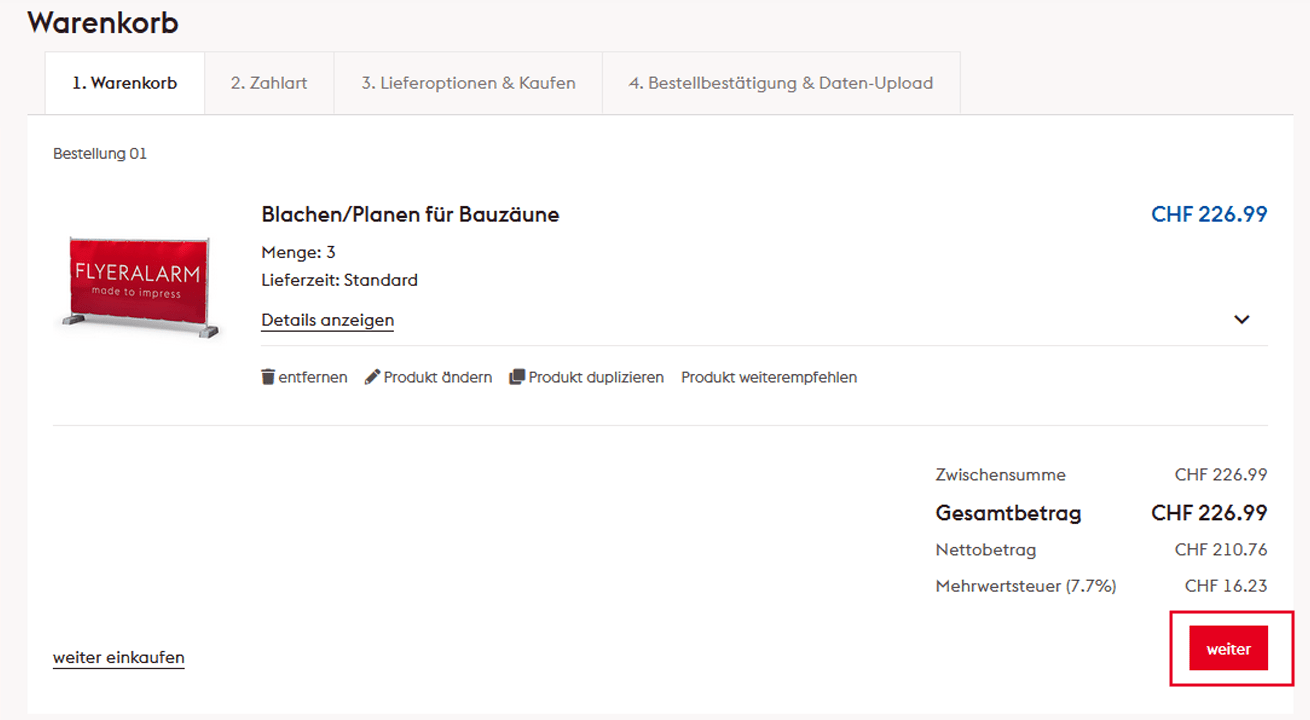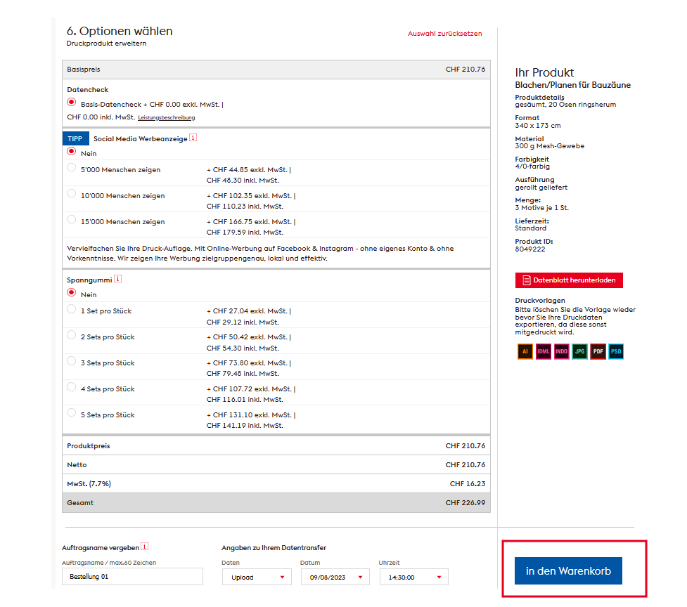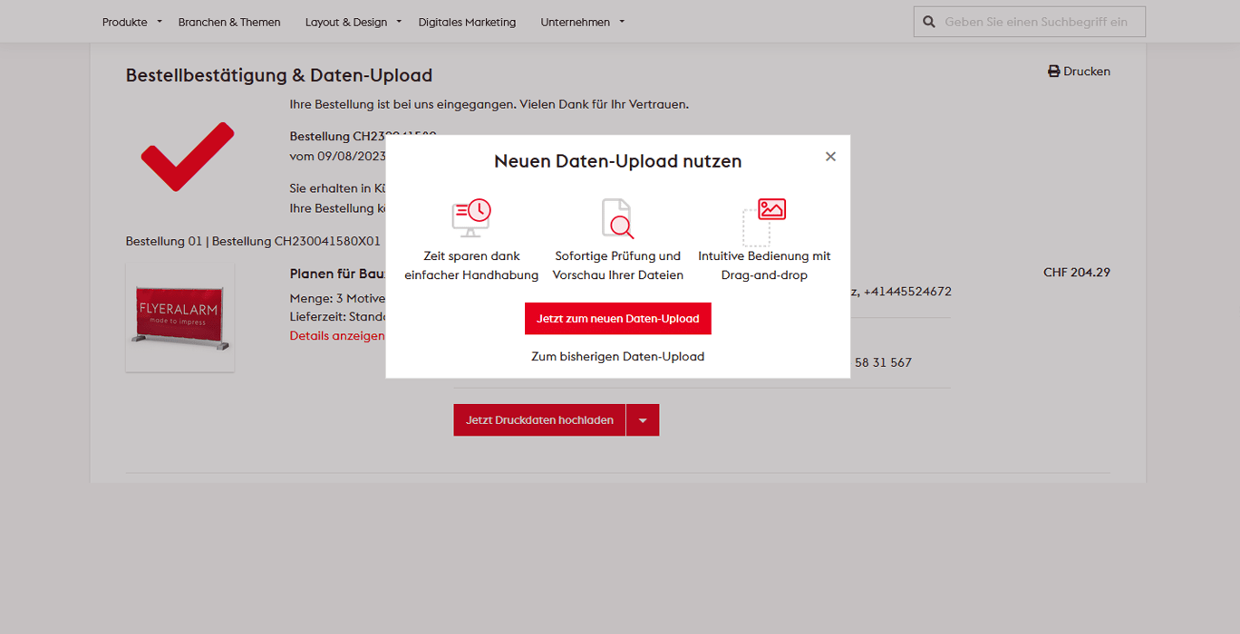 Fertig! Nach dem automatischen Datencheck werden Ihnen Ihre Planen für Bauzäune wie gewünscht geliefert. Wann Ihre Bestellung eintrifft, können Sie jederzeit in Ihrem Kundenkonto einsehen. Hier haben Sie ausserdem die Möglichkeit, Ihre Druckdaten erneut hochzuladen falls Anpassungen nach dem Datencheck notwendig werden sollten.