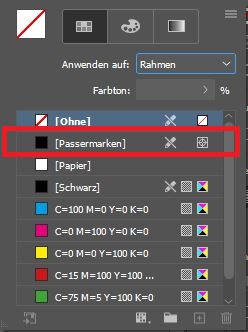 Registerfarbe, je nach Programm auch Passermarkenfarbe, Passkreuze oder schlicht All genannt, wurde früher für technische Marken auf Druckbogen verwendet. Diese Markierungen sind beim modernen Sammeldruck nicht mehr nötig – dennoch können Sie in vielen Layoutprogrammen Registerfarbe anlegen. Das kann zu Produktionsfehlern führen.
