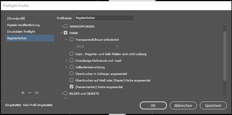 Schritt 3: Es öffnet sich das Fenster Preflight-Profile. Der Einfachheit wegen wird in diesem Beispiel ein extra Profil nur für die Suche nach Registerfarbe angelegt – natürlich können Sie diese Fehlersuche auch in bestehende Preflight-Profile integrieren. Um ein neues Profil anzulegen, klicken Sie auf das kleine Plus unter der Profil-Liste und benennen Sie das Profil. Anschliessend deaktivieren Sie alle Häkchen, öffnen das Dropdown-Menü bei Farbe und setzen einen Haken bei [Passermarken]-Farbe angewendet. Anschliessend bestätigen Sie mit OK.