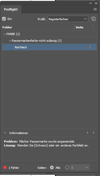 Schritt 4: Aktivieren Sie jetzt im Preflight das eben angelegte Profil, so werden Ihnen ein oder mehrere Fehler angezeigt. Je nachdem, wie viele Elemente Sie mit Registerfarbe angelegt haben. In diesem Fall wird ein Fehler angezeigt. Öffnen Sie nun das Dropdownmenü unter der Fehlermeldung Passermarkenfarbe nicht zulässig. Hier wird nun das Rechteck aufgeführt – offensichtlich wurde dieses versehentlich mit einer Registerfarbe – in InDesign Passermarkenfarbe genannt – angelegt.