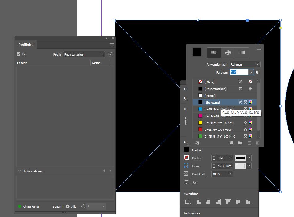 Schritt 5: Ersetzen Sie nun die Registerfarbe des Elements durch eine andere – zum Beispiel Reinschwarz bei Texten (C = 0, M = 0, Y = 0 und K = 100) oder Tiefschwarz bei grafischen Elementen (C = 60, M = 40, Y = 20, K = 100). Sobald Sie alle Elemente umgefärbt haben, wird im Preflight kein Fehler mehr angezeigt. Ihre Druckdaten sind jetzt optimal druckbar.
