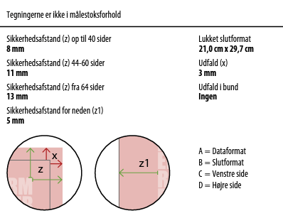 Du finder også information om sikkerhedsmarginer for grafisk og tekstligt indhold her. I dette tilfælde er sikkerhedsmargenen 8 mm pr. side, da magasinet skal have færre end 40 sider.