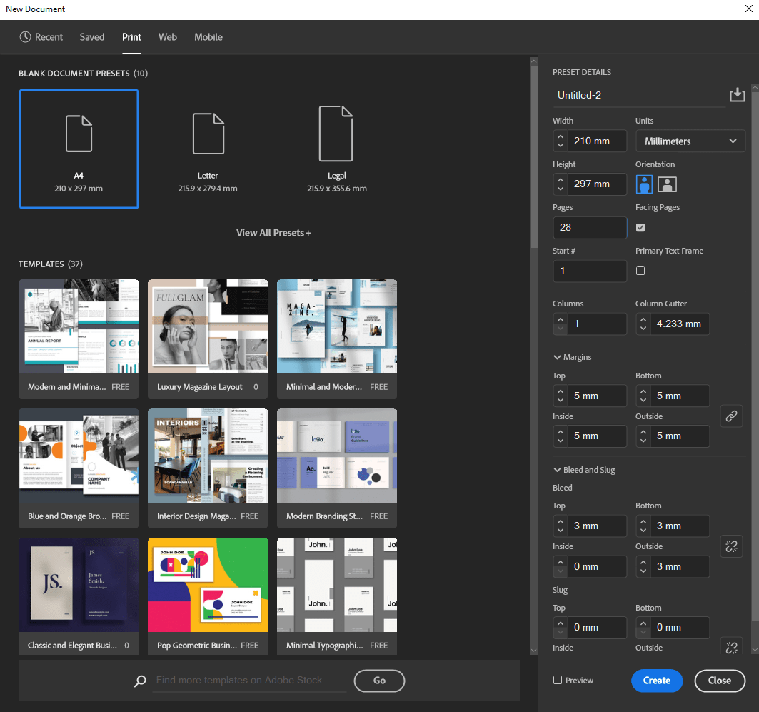 At skabe trykdata til et magasin i InDesign adskiller sig næppe fra at skabe trykdata til andre produkter. Du kan derfor stort set følge vejledningen “Oprettelse af en trykbar PDF med InDesign“. For magasiner med hæftet ryg er det dog lidt vanskeligt at definere bleeden, fordi du skal oprette for- og bagside samt dobbeltsider til den indre sektion, og bleeden må kun vises på tre sider. Bare hold dig til disse enkle trin, så kan intet gå galt, når du laver et magasin: