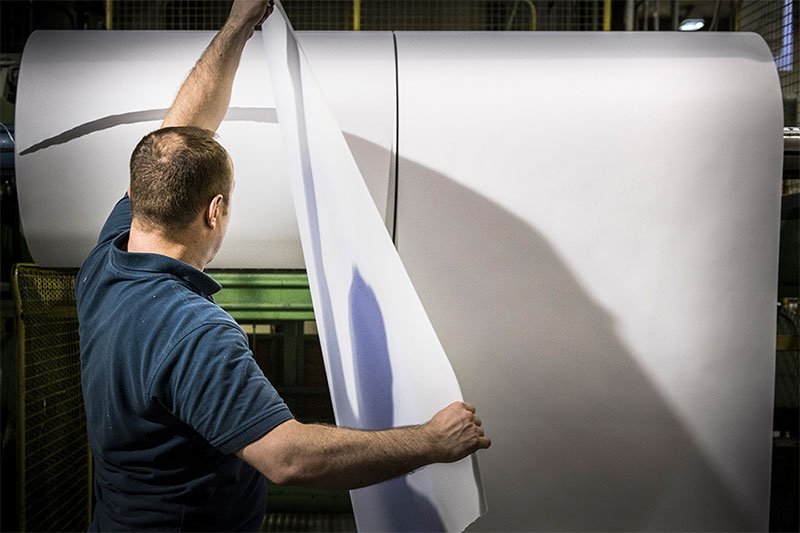 C’est à partir de là que la fabrication du papier de lin se distingue des autres types de papier : Dans une calandre spéciale équipée de cylindres de gaufrage, la structure caractéristique du lin est gaufrée dans le papier. Les motifs, les formes de gaufrage, la pression et la chaleur doivent être parfaitement adaptés les uns aux autres afin de produire une structure réaliste et un papier stable.