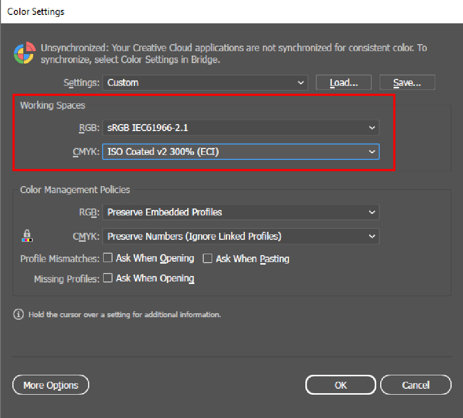 För att arbeta direkt med rätt färgprofil i Illustrator väljer du Edit> Color settings på menyn, klickar på “More options” och väljer lämpligt CMYK-färgrymd.